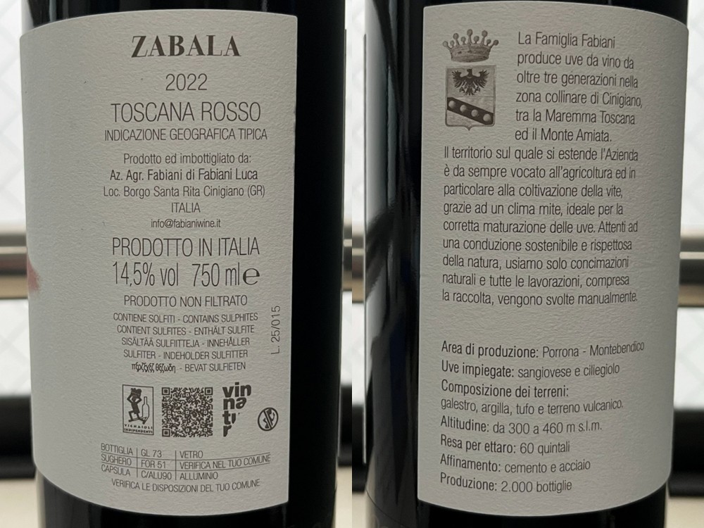 The grape varieties are 90% Sangiovese and 10% Ciliegiolo. It’s a combination of my favorite varieties, so it looks delicious. There’s a lot written on the back label; please read it if you’re interested. It seems the grapes were hand-picked, naturally fermented for 30 days, and aged in concrete and stainless steel tanks. Let’s drink it!