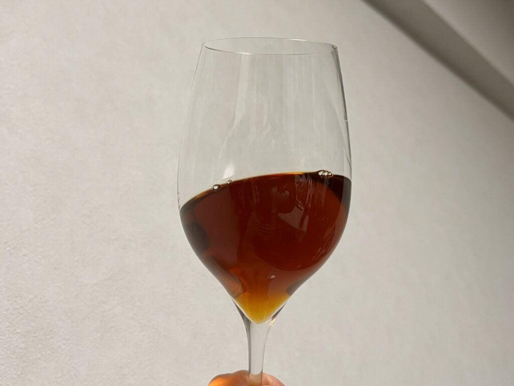 これ、白ワインとは言えないほど色が付いています。濃い琥珀色でまるでウイスキーみたい。