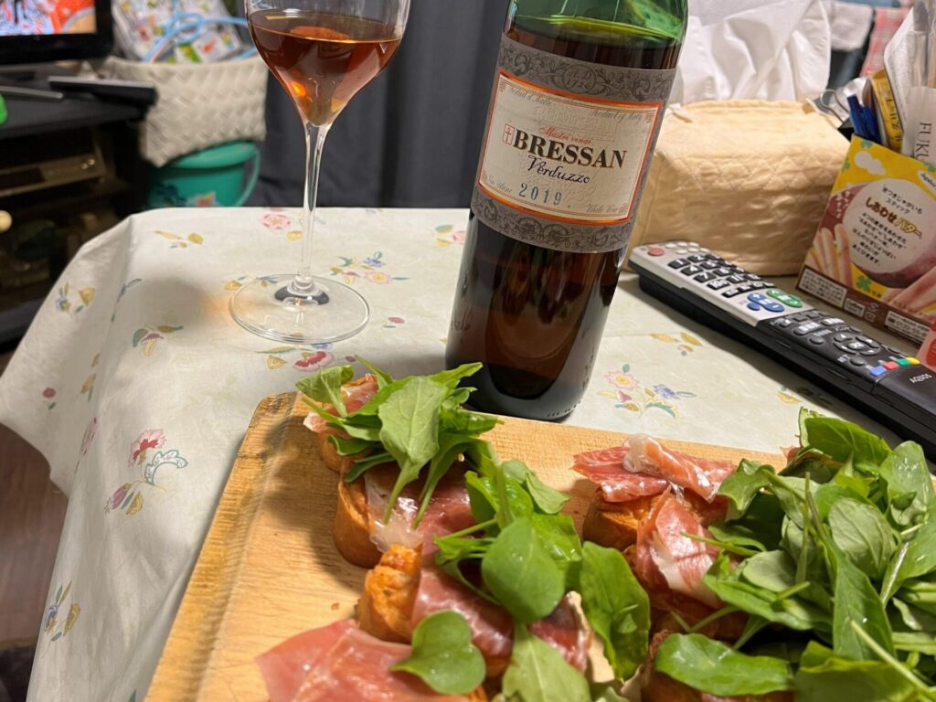 料理は、バゲットをつかったスペイン産の生ハムとベビールッコラのピザトーストです。このワイン、おススメです。