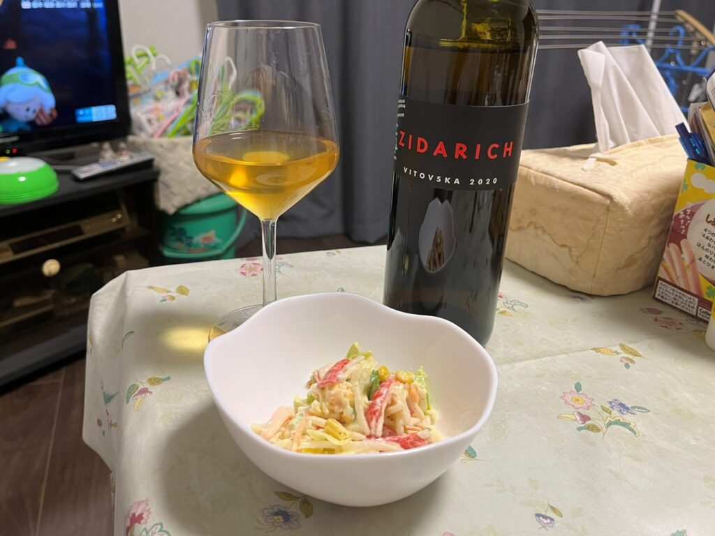今日は、前菜にカニサラダを作りました。もちろん、「カニ」と言っているのは「カニカマボコ」です。